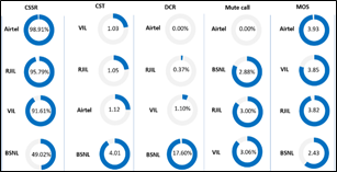 CSSR: Call Setup Success Rate (in %), CST: Call Setup Time (in seconds), DCR: Drop Call Rate (in %) &MOS: Mean Opinion Score.