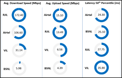 Latency (Overall):Airtel, BSNL, RJIL and VIL 50thpercentile latency is 24.30ms, 25.10ms, 27.75ms, 35.90 ms.