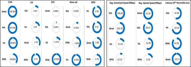 Call Setup Success Rate– Airtel, BSNL, RJIL and VIL have call setup success rate of 100.00%, 36.89%, 99.76% and 98.82% respectively in Auto-selection mode (5G/4G/3G/2G).