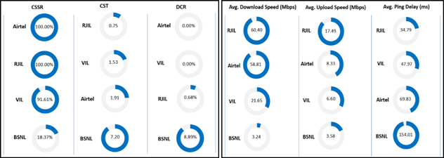 Call Setup Success Rate– Airtel, BSNL, RJIL and VIL have call setup success rate of 100.00%, 18.37%, 100.00% and 91.61% respectively in Auto-selection mode (5G/4G/3G/2G).