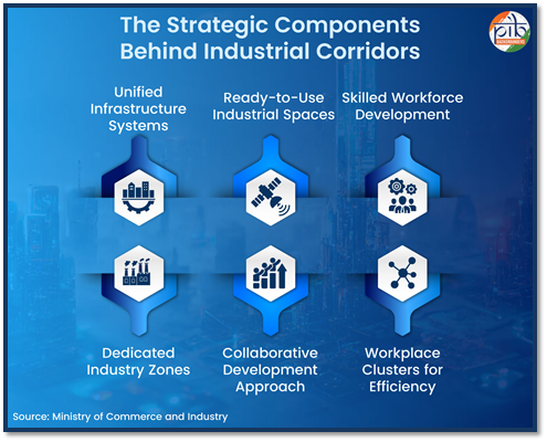 Industrial corridors are linear development zones that connect major economic centres through an integrated network of roads, railways, ports, and airports. The defining features of these corridors are: