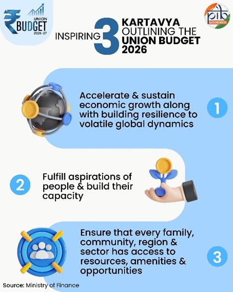 With a focused commitment to the poor, underprivileged, and disadvantaged, the Budget outlines three key Kartavyas: to accelerate and sustain economic growth; to fulfil the aspirations of the people; and to build capacities while ensuring that every family, community, region, and sector has equitable access to resources, amenities, and opportunities for meaningful participation in the nation’s development.