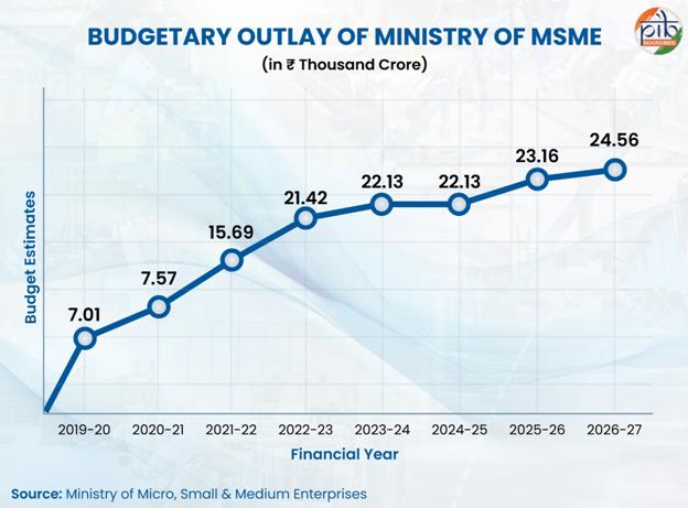 The Ministry of Micro, Small & Medium Enterprises envisions a vibrant MSME sector by promoting its growth and development.  It primarily supports states in promoting entrepreneurship, generating employment and livelihood opportunities, and strengthening the competitiveness of MSMEs. Over the years, the Budget outlay for the Ministry has been on a consistent rise, focusing on the long-term goal to enhance the performance of MSMEs through skill and entrepreneurship development.