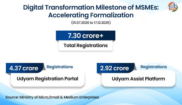 The MSME sector witnessed a digital transformation milestone in 2025 with formalization on the rise. Over 7.30 crore enterprises have been registered on Udyam Registration Portal and Udyam Assist Platform, from 1 July 2020 to December 2025. This includes 4.37 registrations on the Udyam Portal and 2.92 crore on the Udyam Assist Platform.