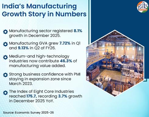 Manufacturing performance has strengthened further in recent quarters, with GVA growth of 7.72% in Q1 and 9.13% in Q2 in FY 2025-26 , supported by a gradual shift towards higher-value production, improved industrial infrastructure, and wider adoption of technology and formalisation, together reflecting rising industrial capability across the sector.