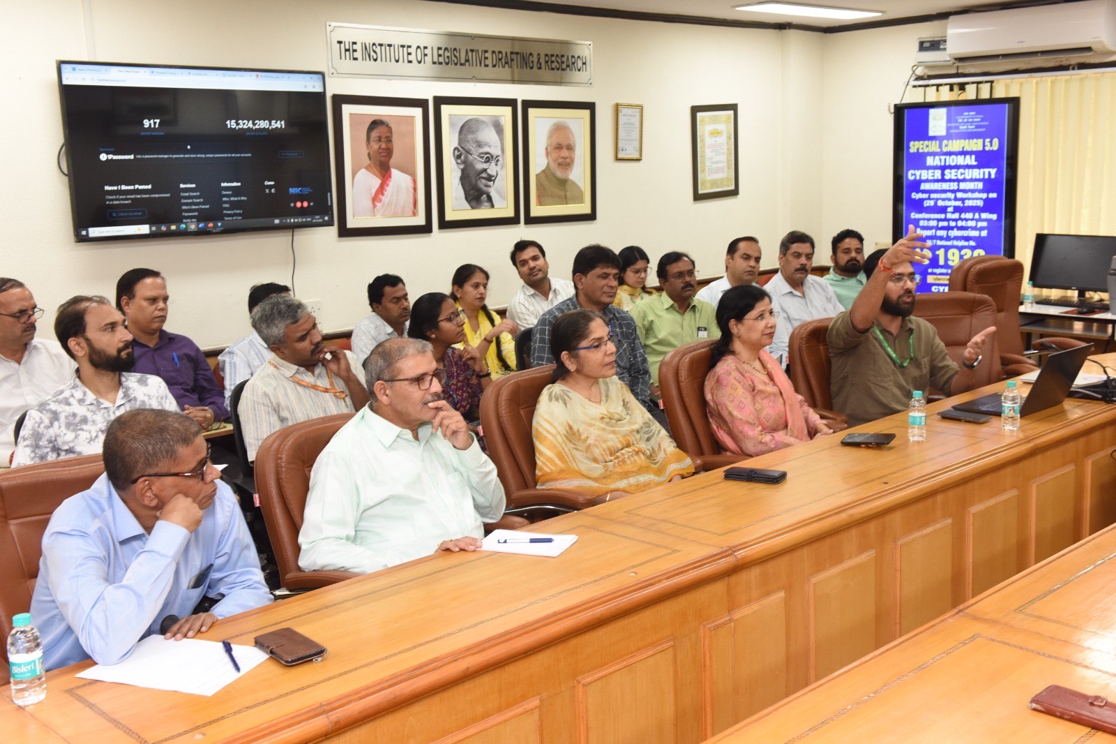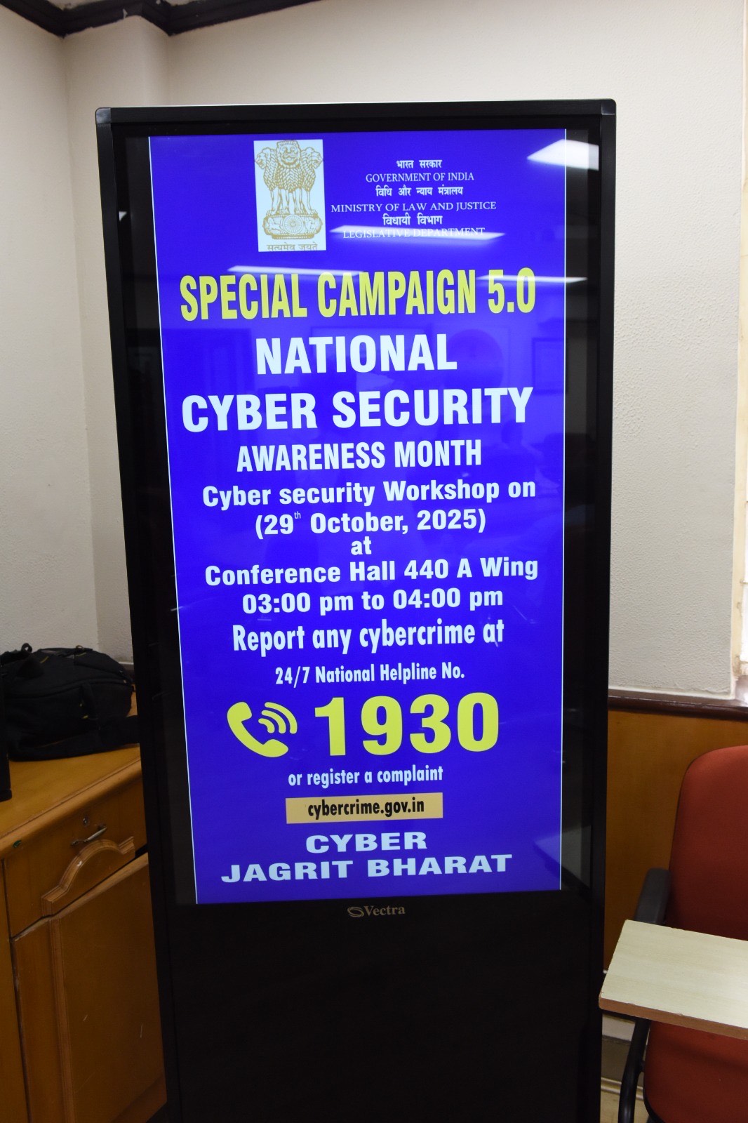 As part of Special Campaign 5.0, the Legislative Department organized a special workshop on “National Cyber Security” on 29th October, 2025. The Workshop was chaired by Dr. Rajiv Mani, Secretary with the presence of Shri R.K Pattanayak, Additional Secretary and Nodal Officer, Dr. Manoj Kumar, Additional Secretary, Dr. K.V Kumar, Additional Secretary and other Senior Officer of this department. The session was conducted by experts from the National Informatics Centre (NIC). The objective of the workshop is to create awareness among officials and staff about cyber security, data protection, password management, identification of phishing emails, and best practices for maintaining safe digital behaviour. NIC experts shared practical tips on maintaining cyber hygiene and informed participants about the latest tools and measures to ensure digital safety. A large number of officers and staff members from the department actively participated in the session and resolved to incorporate cyber hygiene practices into their daily official work. This initiative marks an important step under Special Campaign 5.0 towards promoting digital awareness and strengthening cyber security culture within the department. The Workshop has been conducted successfully under the Supervision of Shri R.K Pattanayak, Additional Secretary and Nodal Officer of Special Campaign 5.0 along with Smt. Rakhi Biswas, Under Secretary, Shri Prashant Bhardwaj, Section Officer and other officer/staff of the Legislative Department.