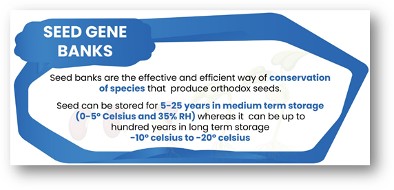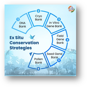 Ex situ conservation means protecting plant genetic resources outside their natural habitats under controlled conditions to ensure long-term preservation and possible reintroduction into the wild. In India, this includes the conservation of 9,361 medicinal and aromatic plant (MAP) accessions at the National Seed Gene Bank, National Bureau of Plant Genetic Resources (NBPGR), New Delhi. These ex-situ methods are used for species with poor seed formation or vegetative propagation. Together, they help secure medicinal plant diversity for future use.